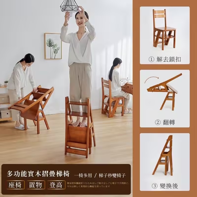 5分鐘前【現貨】二合一折疊梯子椅,木料製作,打磨精緻,可變為簡易小梯子,可幫助拿取高處物品 - 【三層|純實木|翻转收纳】NT$2580